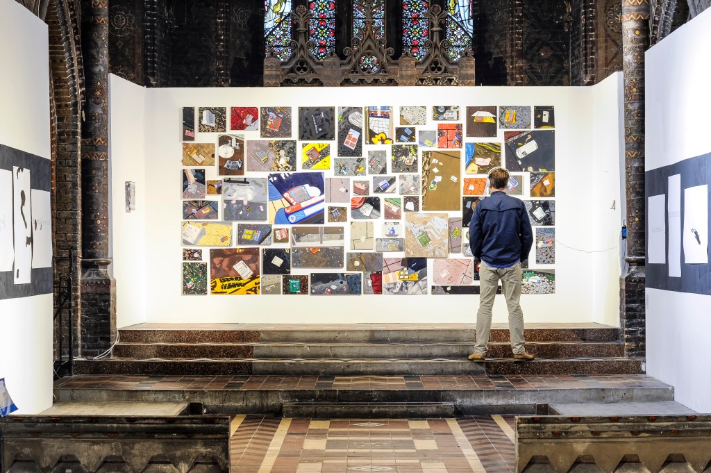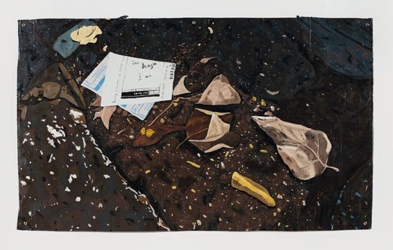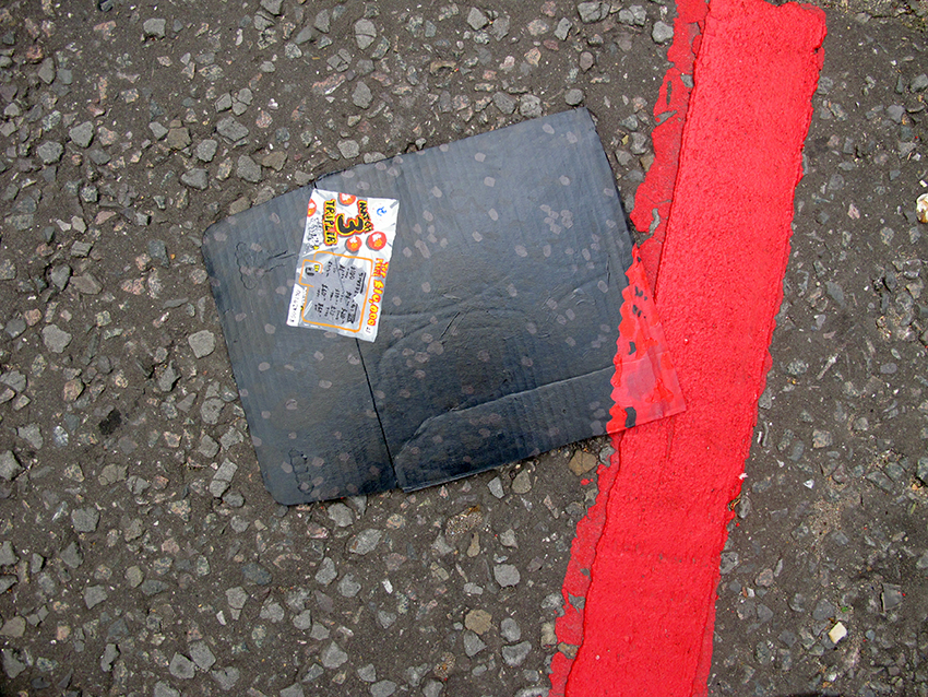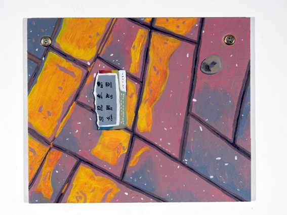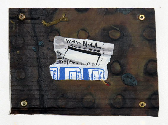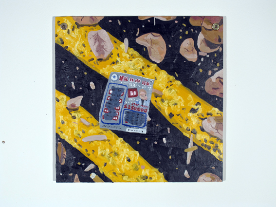 The imagery and materials for the paintings come from London streets, with images of betting stubs, scratch cards and lottery tickets collected with the artist’s phone camera while he goes about his daily business. On these same footpaths and roadsides the artist gathers discarded packaging, card and wood for the captured images to be painted on.