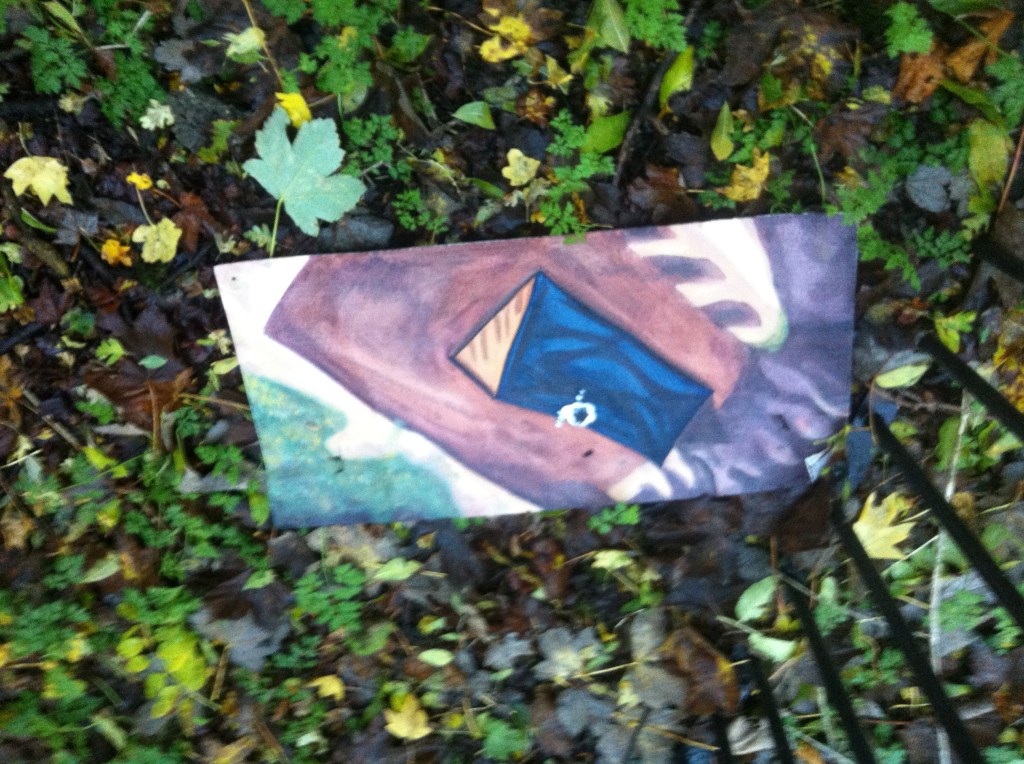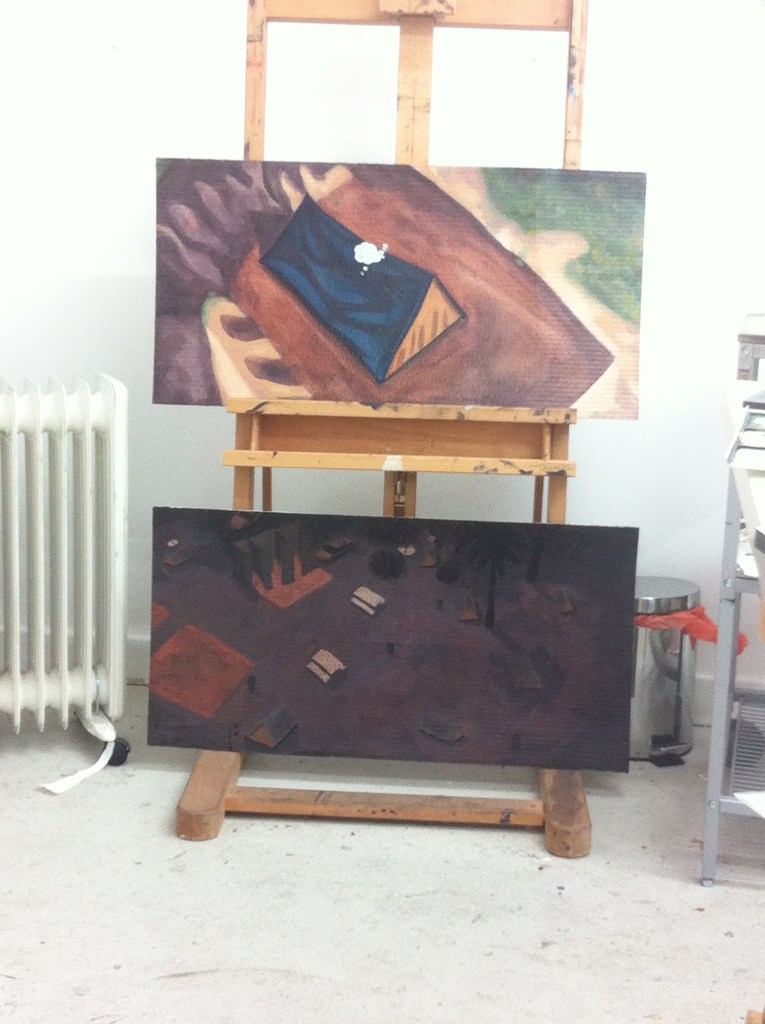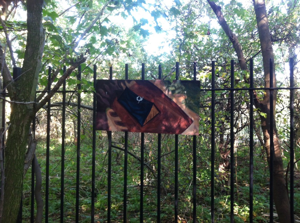 Installed as part of the Guerrilla Sculpture Park at the Artilicks Weekend Festival in 2015. This work took two images from the Sim City PC game depicting homelessness in game and painted them on card. These were attached to a fence in the Middlesex Filter Beds in Hackney where they were left to face the elements. Link to the exhibition below. Both paintings are oil on card.